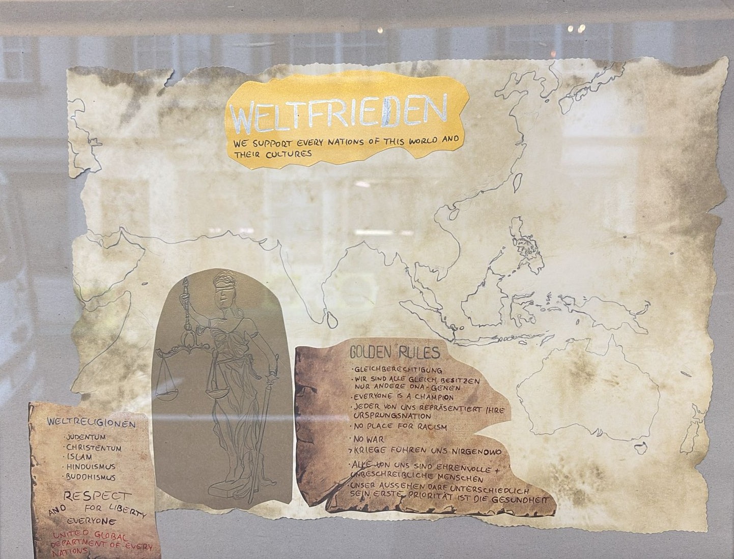 Auf der rechten Seite stehen die goldenen Regeln, welche jede*r Mensch besitzt und ein gutes Miteinander ermöglicht. Auf der linken Seite sind die Weltreligionen aufgeführt. Diese zeigen uns, dass wir auch zwischen unterschiedlichen Kulturen im Herzen und mit Liebe vereint sein können.